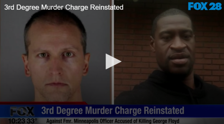 3rd Degree Murder Charge Reinstated by Fox 28 Spokane | @ | March 12, 2021 3:09 pm TwitterFacebookGoogle+LinkedInPinterest 0 The police officer accused of killing George Floyd is once again facing third degree murder charges. Related Posts Bloomsday is Back! No Whining About Wine Headlines for June 2 2021