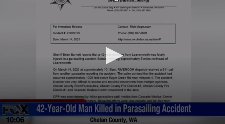 42-Year-Old Man Killed in Parasailing Accident by Fox 28 Spokane | @ | March 15, 2021 3:29 pm TwitterFacebookGoogle+LinkedInPinterest 0 A man from Leavenworth died in a parasailing accident. Related Posts Bloomsday is Back! No Whining About Wine Headlines for June 2 2021