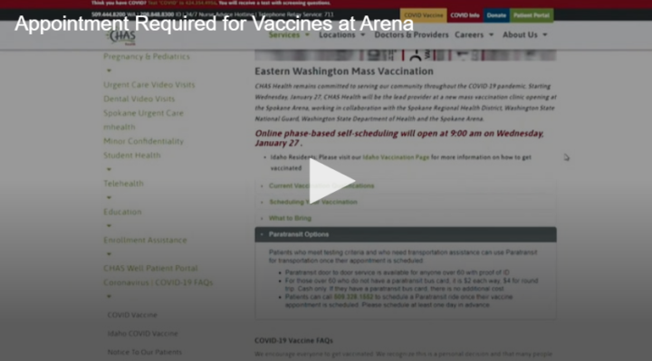 Appointment Required for Vaccines at Arena by Fox 28 Spokane | @ | January 27, 2021 2:32 pm TwitterFacebookGoogle+LinkedInPinterest 0 Watch more to find out how you can make an online appointment to receive a vaccination at the Spokane arena. Related Posts Bloomsday is Back! No Whining About Wine Headlines for June 2 2021