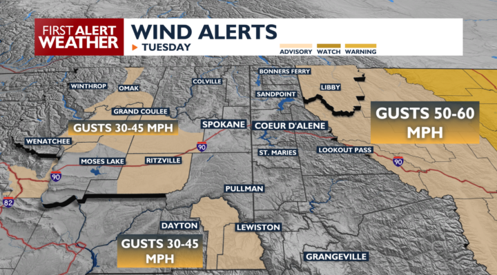 Wind Advisories are in effect around the region from 8 a.m. to 5 p.m. Tuesday. Winds will gust up to 45 mph in the Blue Mountains, Upper Columbia Basin, Okanogan Valley, and Northwest Montana. Gusts up to 35 mph will occur around Spokane and Coeur d’Alene. High temperatures will stay in the mid-50s to mid-60s with very dry air, increasing the risk for grass fires. Some blowing dust is also a possibility in Central Washington.