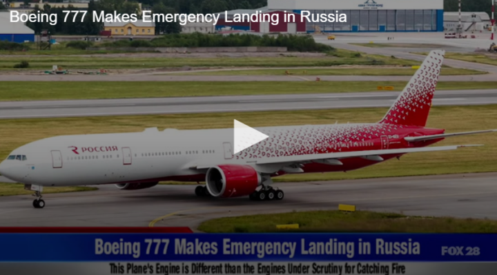 Boeing 777 Makes Emergency Landing in Russia by Fox 28 Spokane | @ | February 26, 2021 3:54 pm TwitterFacebookGoogle+LinkedInPinterest 0 News from Russia, one of the Boeing 777 jets has had to make an emergency landing in Moscow after an engine sensor problem. Related Posts Bloomsday is Back! No Whining About Wine Headlines for June 2 2021