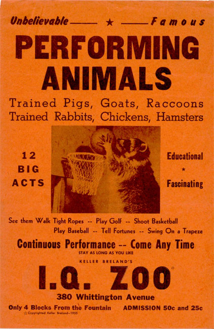 In 1955, Keller and Marian opened the IQ Zoo at 380 Whittington Avenue in Hot Springs (it was later moved to 422 Central Avenue). The IQ Zoo featured a showcase of animals trained by the Brelands and served as a training facility. Popular acts included chickens that walked tightropes, dispensed souvenirs and fortune cards, danced to music from jukeboxes, played baseball and ran the bases; rabbits that kissed their (plastic) girlfriends, rode fire trucks and sounded sirens, and rolled wheels of fortune; ducks that played pianos and drums; and raccoons that played basketball. The History Channel rated the IQ Zoo one of the most popular roadside tourist attractions during the twentieth century.