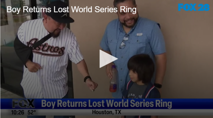 Boy Returns Lost World Series Ring by Fox 28 Spokane | @ | June 21, 2023 12:22 pm TwitterFacebookGoogle+LinkedInPinterest A young boy in Texas found a lost 2022 World Series ring and returned it to its rightful owner. Check out the full story here. Related Posts Art Program Helps Disabled People Weekend Digest Jan 10-11 Animal Antics With Monkeys And Donkeys