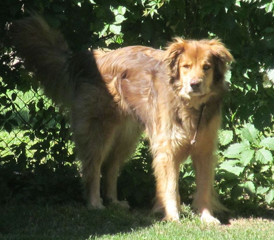 He’s lounging now, two days later, luxuriating in the much cooler weather and (even better) rain. He stands in the rain at the back fence, waiting for his friend, our neighbor, who will bring him treats. When I call him back to the house, he stops on the way—first he’s gotta roll in that wonderful wet grass! Then he runs inside. Such a contrast to his uncomfortable slowness in the heat.