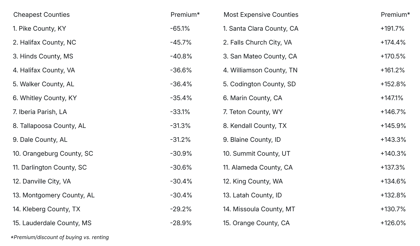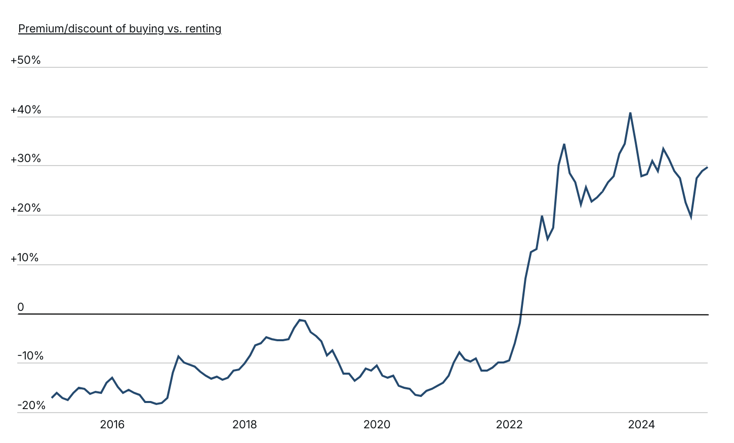 - The affordability gap flipped fast: Since the start of 2021, mortgage rates have more than doubled and home prices remain approximately 33% higher, driving a surge in the “buying premium” across most U.S. markets.