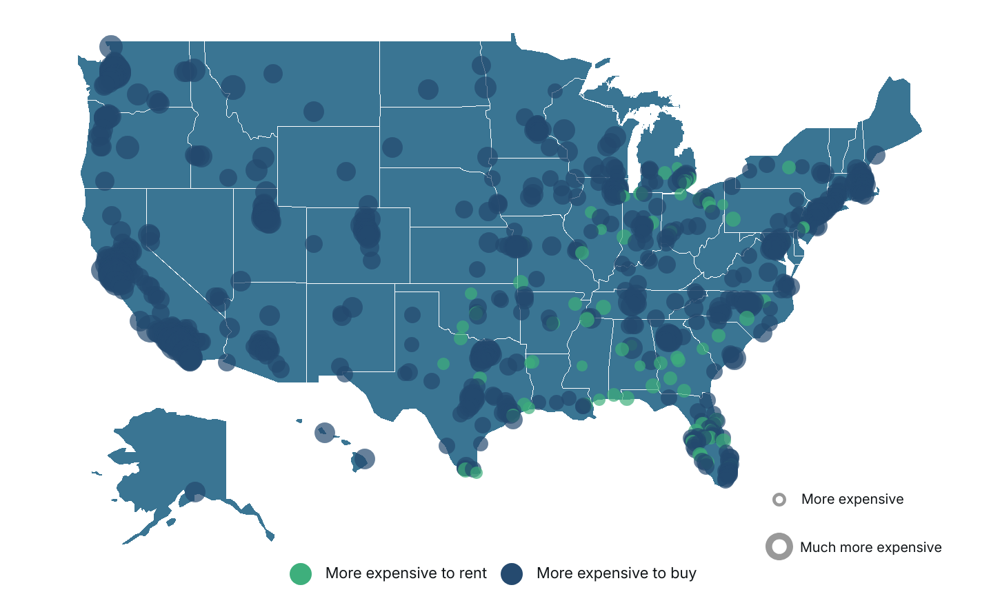- Only a small fraction of cities favor buyers: Just 95 out of the 838 U.S. cities analyzed still offer a cost advantage to buying—mostly in lower-cost Southern and Rust Belt markets.