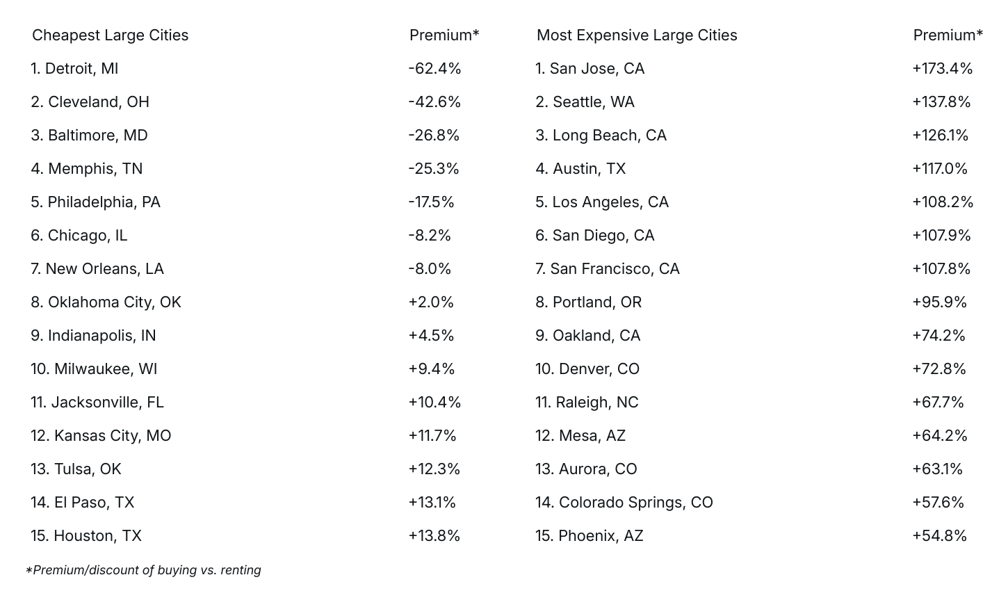 - Location drives extreme differences: In over 100 cities, the median monthly mortgage payment is now more than double the median rent. But places like Detroit and Cleveland offer 40% to 60% savings for buyers compared to renters.