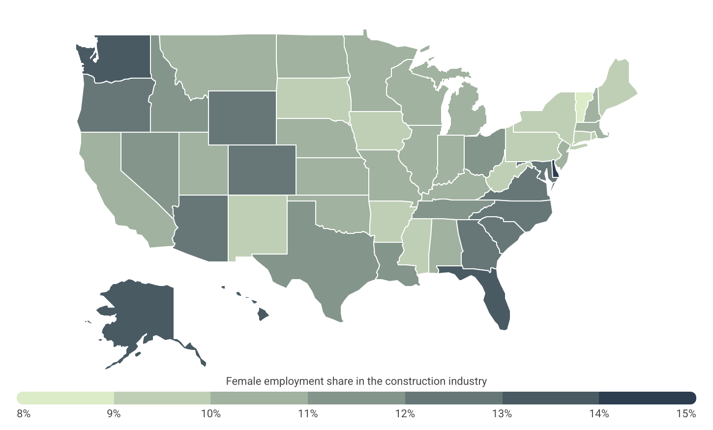Delaware and Florida lead the nation in female construction employment, with women making up 14.2% and 13.5% of the industry’s workforce, respectively. These states likely benefit from the relatively high wages offered in the construction sector, which can be an attractive factor for women entering the field. Remotely located states like Alaska (13.3%) and Hawaii (13.2%), and parts of the Pacific Northwest, such as Washington (13.0%) and Oregon (12.7%), also report female representation above the national average of 11.7%.