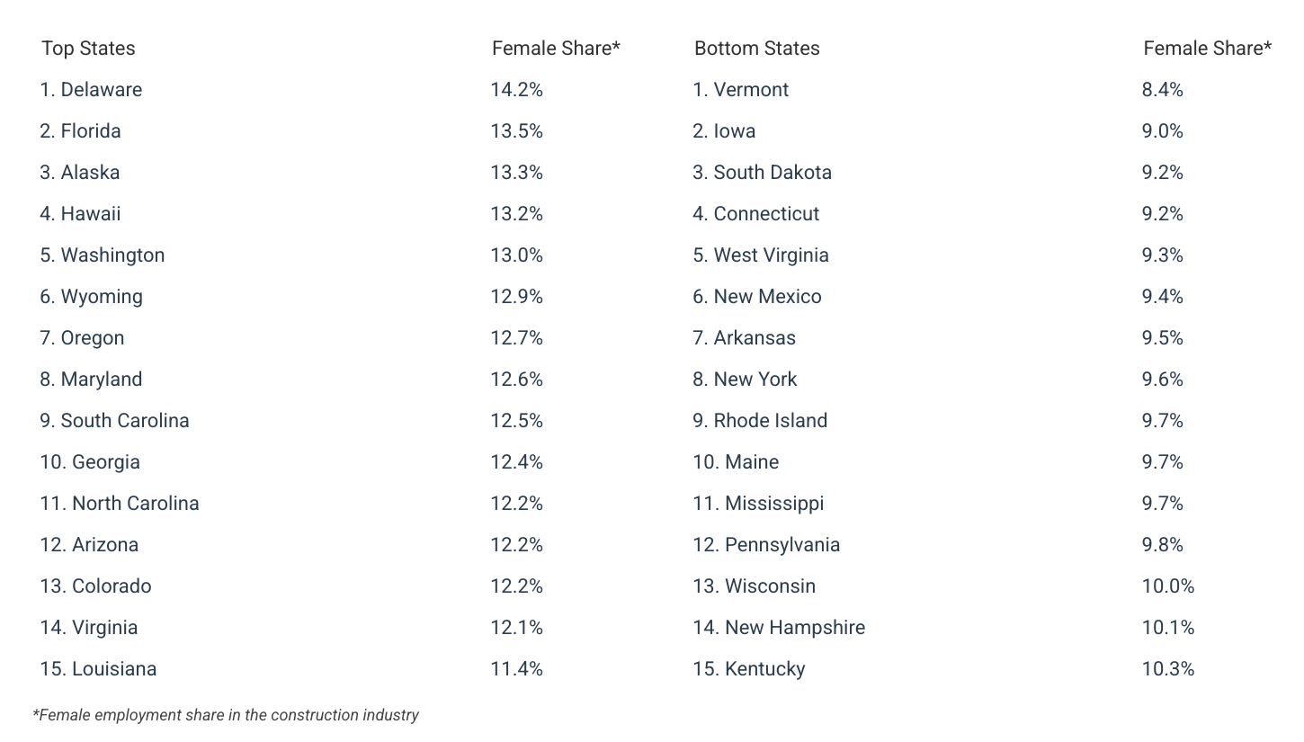 Delaware has the highest share of women working in the construction sector