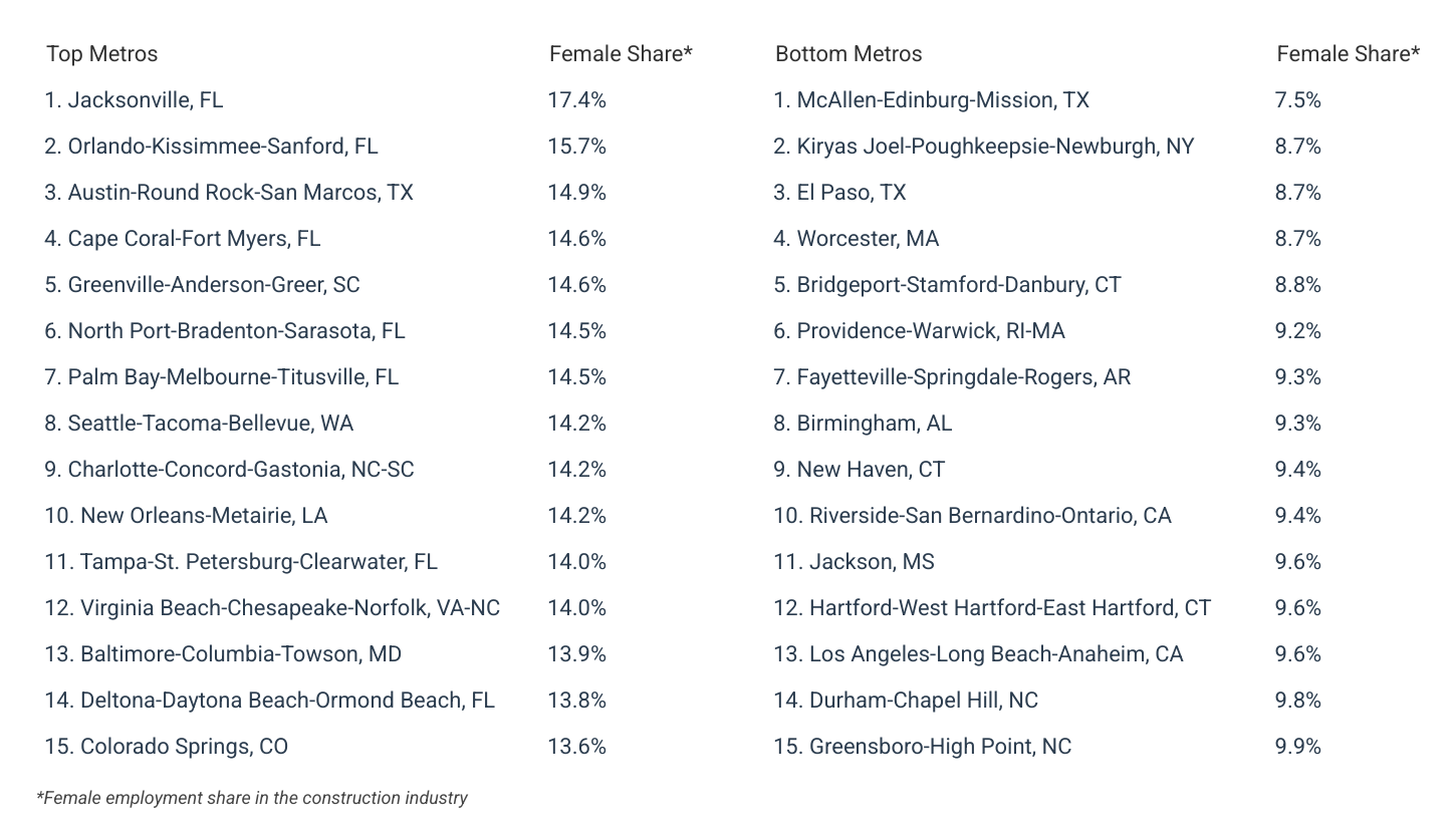 For complete results, see Cities With the Most Women in Construction on Construction Coverage.