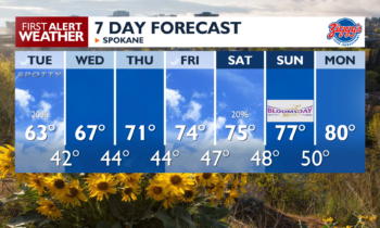 Expect to spend the day in the 40s and low 50s with partly cloudy sky conditions. A light to moderate northwest wind will keep us in sweater territory through the day. Wind gusts in the afternoon could briefly get up to 30 mph. A few early showers are possible in the northern Idaho Panhandle, followed by widespread off-and-on rain showers in the afternoon and early evening.