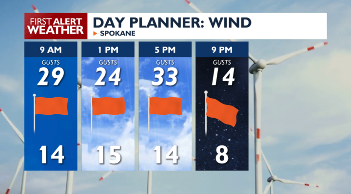 Expect to spend the day in the 40s and low 50s with partly cloudy sky conditions. A light to moderate northwest wind will keep us in sweater territory through the day. Wind gusts in the afternoon could briefly get up to 30 mph. A few early showers are possible in the northern Idaho Panhandle, followed by widespread off-and-on rain showers in the afternoon and early evening.