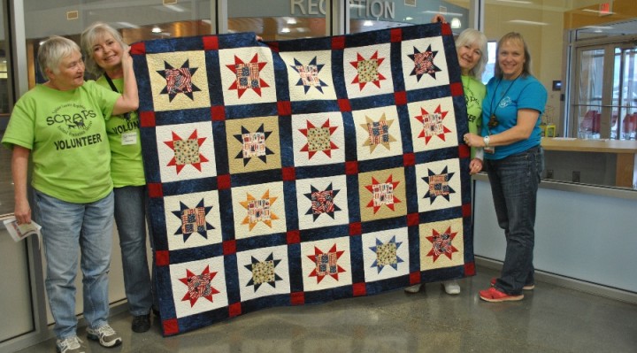 QOV’s are stitched with love, prayers and healing thoughts. This particular quilt was made by a group of volunteers at SCRAPS called the SCRAPS Sew Sisters. Normally they work to create dog beds, fleece jackets and other items that are sold at the SCRAPS Bow Wow Meow Market. This quilt represents months of work and donations of time and material. Members of the group and staff from SCRAPS will be on hand to see Keats accept the quilt and offer their gratitude for his military service.