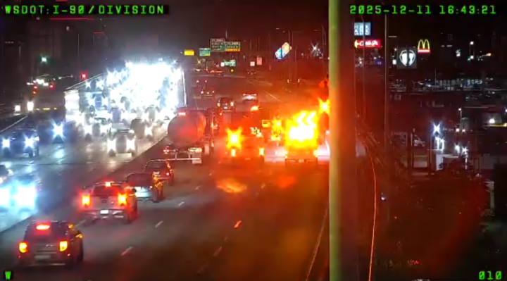 According to the Washington State Department of Transportation (WSDOT), the crash has blocked the right two lanes of I-90 westbound at milepost 281 near the Highway 2 Couplet–Browne Street on-ramp.