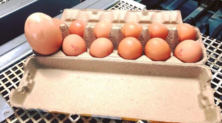 According to the company’s Facebook page, the average egg weighs approximately 58 grams, but this self-described “whopper” weighed in at 176 grams.