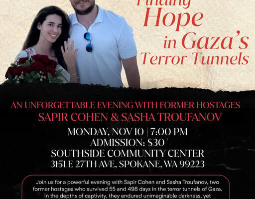 “Join us for an unforgettable evening of strength, faith, and resilience with former hostages Sapir Cohen and Sasha Troufanov. Hear their powerful story of survival, hope, and the unbreakable human spirit,” the Chabad of Spokane County wrote on their webpage about the event.