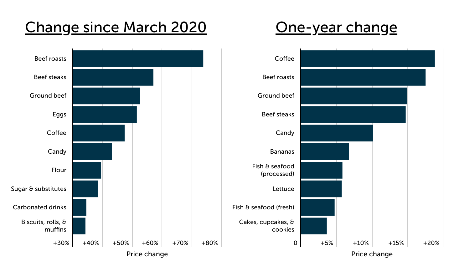 - Beef products have seen the sharpest price increases since the pandemic began. Beef roasts (+73.8%), beef steaks (+57.0%), and ground beef (+52.5%) rank as the top three items with the largest price gains since the pandemic.