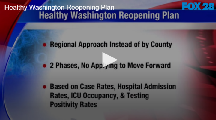 Healthy Washington Reopening Plan by Fox 28 Spokane | @ | January 6, 2021 2:05 pm TwitterFacebookGoogle+LinkedInPinterest 0 There is a new plan for reopening WA that Governor Inslee has put out that will go into effect this Monday. Related Posts Bloomsday is Back! No Whining About Wine Headlines for June 2 2021