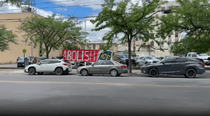 Protestors waiting inside and outside the building – the protestors outside supported a large banner bearing the words “Abolish ICE.”