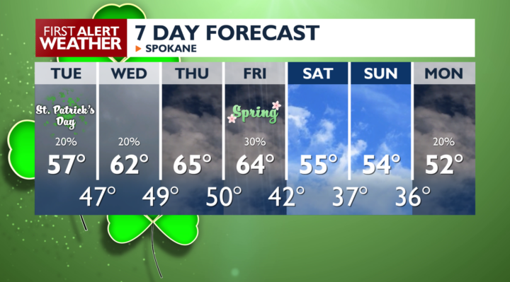 Much warmer weather is here, along with breezy winds and (mostly) mountain rain showers for St. Patrick’s Day.