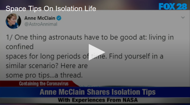 Isolation Tips From Astronauts by Fox 28 Spokane | @ | March 23, 2020 10:01 am TwitterFacebookGoogle+LinkedInPinterest 0 Tips on being isolated from experts. Astronauts who spend a lot of time alone or in small groups. Related Posts Bloomsday is Back! No Whining About Wine Headlines for June 2 2021