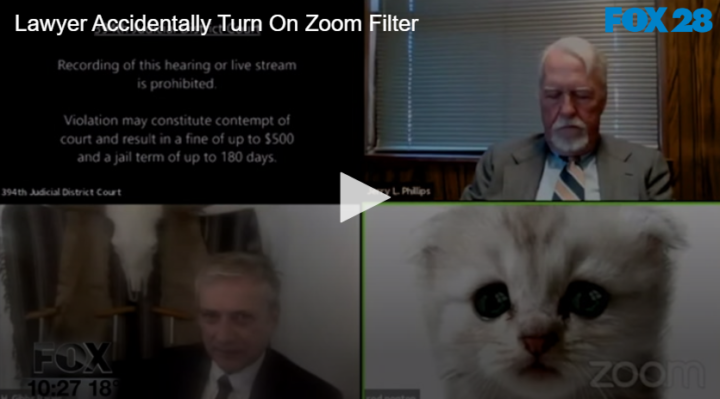 Lawyer Accidentally Turn On Zoom Filter by Fox 28 Spokane | @ | February 10, 2021 12:21 pm TwitterFacebookGoogle+LinkedInPinterest 0 A lawyer in Texas accidently turned on a cat filter while presenting a case over Zoom. Related Posts Bloomsday is Back! No Whining About Wine Headlines for June 2 2021