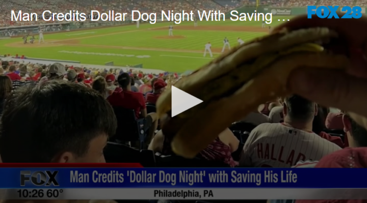 Man Credits Dollar Dog Night With Saving His Life by Fox 28 Spokane | @ | September 23, 2022 12:17 pm TwitterFacebookGoogle+LinkedInPinterest A man in Philadelphia is crediting “Dollar Hot Dog Night” at a Phillies game with saving his life. See it here. Related Posts Art Program Helps Disabled People Weekend Digest Jan 10-11 Animal Antics With Monkeys And Donkeys