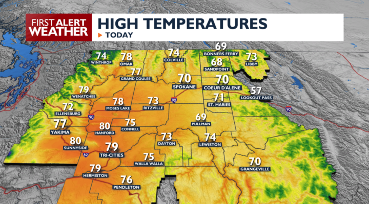 Monday will be the warmest day of the week with highs in the upper 60s to 70s and even some lower 80s in the Columbia Basin. That makes it the warmest day since early October! Clouds increase Monday afternoon as southwest winds begin to gust above 20 mph at times. An isolated shower is possible in our region this evening and overnight, but overall rain chances are very low, under 20%.