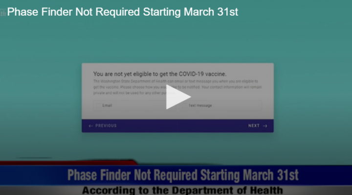 Phase Finder Not Required Starting March 31st by Fox 28 Spokane | @ | March 29, 2021 3:30 pm TwitterFacebookGoogle+LinkedInPinterest 0 There have been some changes to how to schedule your COVID vaccine. Watch the video to learn more. Related Posts Bloomsday is Back! No Whining About Wine Headlines for June 2 2021