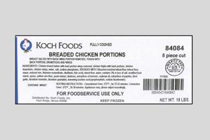 The recalled product was shipped in 18-pound cases that contain four units labeled “FULLY COOKED BREADED CHICKEN PORTIONS.” The case code is: P-1380 126237 B30851 23:11 K04.