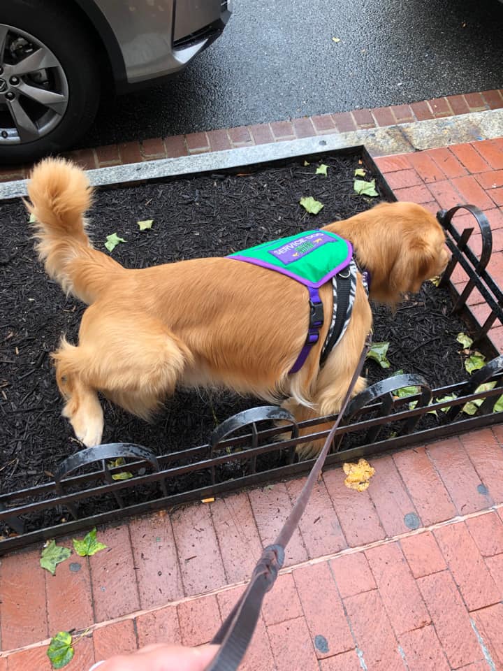 Abigail Witthauer (Alabama) When I got Macallan, I lived in a one-bedroom apartment by myself in the Deep South and I didn’t want to have to potty-train a puppy in the rain/heat/ice that was the reality of a late-summer puppy. I also knew I wanted him to have a lot of potty flexibility as a service dog. This is what we did with him and have done with several others for various reasons. The baby puppy picture is on my apartment balcony when he first came home. That potty spot is “porch potty” brand and it was AWESOME for that purpose.