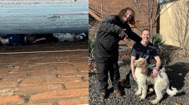 Scout Olson was able to maneuver into the narrow space to reach Rusty with another crew member, helping with guidance from the roof above.