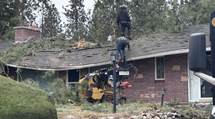 The overnight storm sent trees crashing into multiple homes throughout the Spokane Valley area, particularly near University High School in South Spokane Valley.