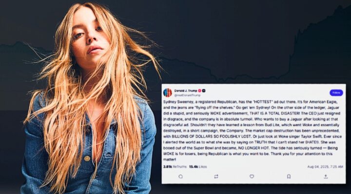 “Sydney Sweeney, a registered Republican, has the “HOTTEST” ad out there. It’s for American Eagle, and the jeans are “flying off the shelves.” Go get ‘em Sydney! On the other side of the ledger, Jaguar did a stupid, and seriously WOKE advertisement, THAT IS A TOTAL DISASTER! The CEO just resigned in disgrace, and the company is in absolute turmoil. Who wants to buy a Jaguar after looking at that disgraceful ad. Shouldn’t they have learned a lesson from Bud Lite, which went Woke and essentially destroyed, in a short campaign, the Company. The market cap destruction has been unprecedented, with BILLIONS OF DOLLARS SO FOOLISHLY LOST. Or just look at Woke singer Taylor Swift. Ever since I alerted the world as to what she was by saying on TRUTH that I can’t stand her (HATE!). She was booed out of the Super Bowl and became, NO LONGER HOT. The tide has seriously turned — Being WOKE is for losers, being Republican is what you want to be. Thank you for your attention to this matter!”