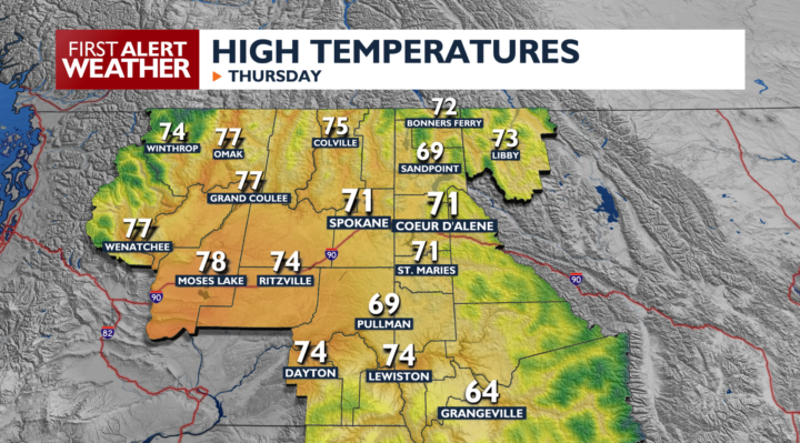 The warming trend intensifies through the weekend, leading to a toasty Bloomsday race in Spokane on Sunday. Race-time temperatures will start in the low 60s and reach the 70s by early afternoon. Late-afternoon highs will soar into the 80s for most areas Sunday through Tuesday. We should expect a couple of temperature readings in the 90s around the lower Columbia Basin during this period. A stray shower or storm is still possible in the greater region on Saturday, thanks to a storm system off the West Coast.