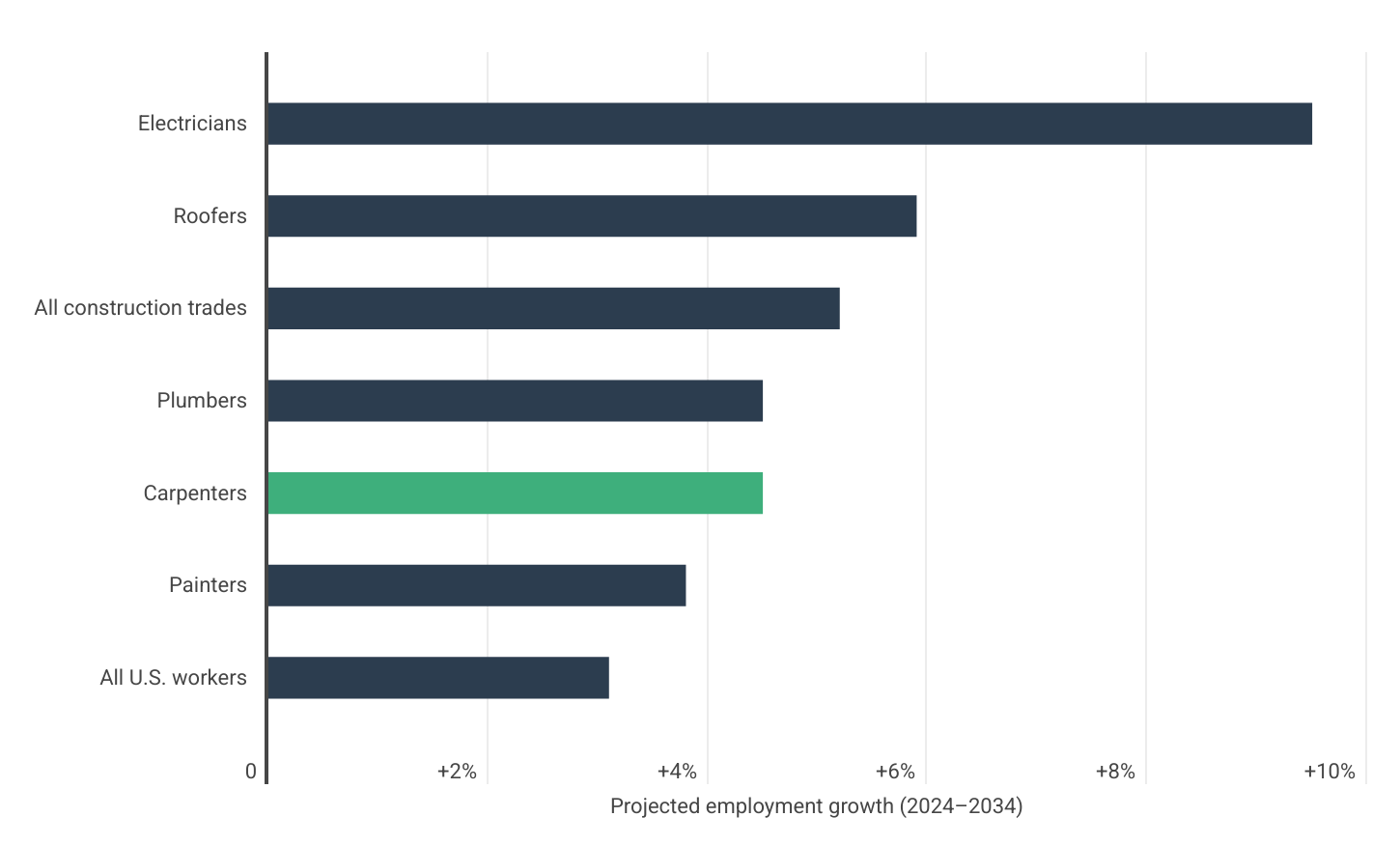 • Job prospects remain strong despite headwinds. The BLS projects total carpenter employment to grow 4.5% in the coming decade, ahead of the 3.1% average across all occupations.