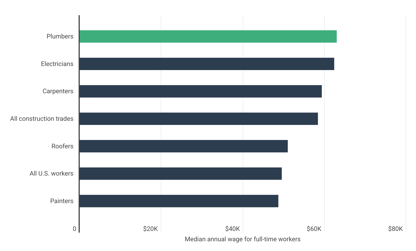 Plumbers earn a median annual wage of $62,970—about 8% more than the average construction worker