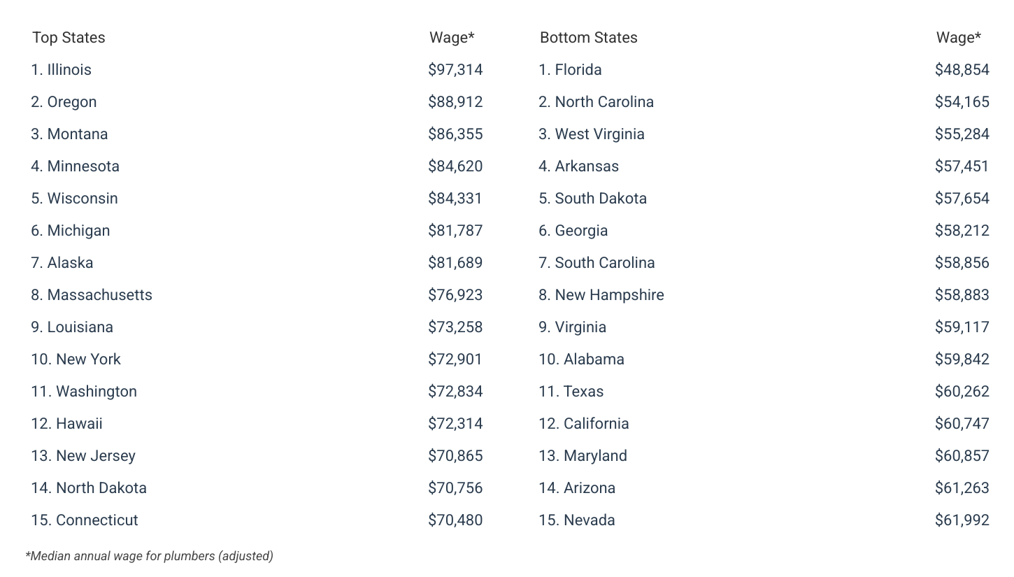 Real plumber wages range from a high of $97,314 in Illinois to a low of $48,854 in Florida
