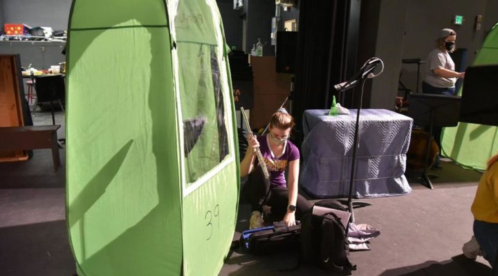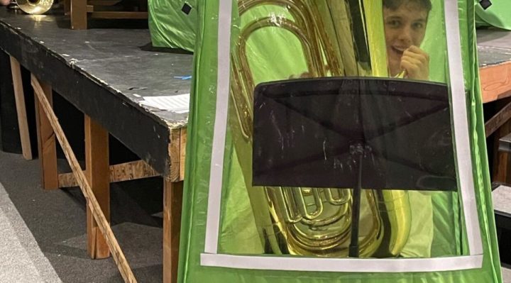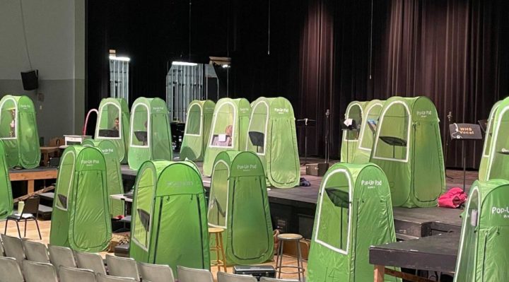 Each band member practices inside a pop-up pod. It’s basically a cloth and plastic enclosure with just enough room for the musician and their instrument.