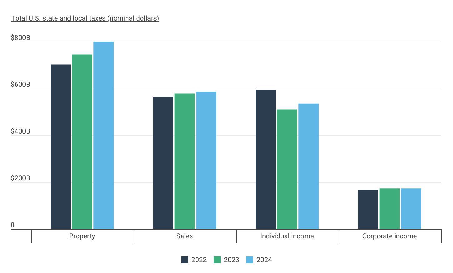 From 2022 to 2024, property taxes saw the largest total increase in revenue among major tax categories, rising by more than $96 billion (13.7%) from $703 billion to $800 billion. This outpaced the growth in sales tax revenue, which increased by just over $21 billion, and corporate income tax revenue, which grew by $5.3 billion. In contrast, individual income tax revenue declined by 10% from 2022 to 2024—a reduction of more than $59 billion—despite modest growth since 2023.