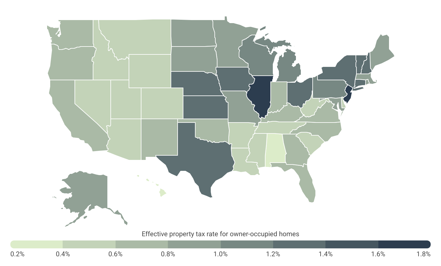 At the state level, the Northeast and Midwest lead with the highest effective property tax rates for owner-occupied homes. Illinois tops the list at 1.793%, followed closely by New Jersey at 1.675%. States like Vermont (1.399%), Nebraska (1.379%), and Connecticut (1.355%) also rank highly, reflecting a trend where densely populated or older, established states often require more revenue to support infrastructure and services. In contrast, the South and Mountain West regions generally have the lowest effective rates, with Alabama (0.372%) and South Carolina (0.438%) near the bottom, along with Arizona (0.426%) and Idaho (0.433%). A notable exception is Texas, which ranks ninth overall, with an effective property tax rate of 1.245%.