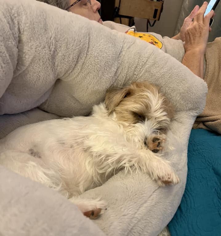 Sheri McEachran (Washington) I have one large dog with mobility issues and a smaller active dog, Eddie, who occasionally shares a dog bed with Poki. He also has a favorite sofa and chair and goes to our bed before us. When we come to bed, Eddie grumbles. (cross between a growl and mumble) and grumpily moves over a bit for us. For a smaller dog he takes up a LOT of space. Eddie also naps in his favorite chair!