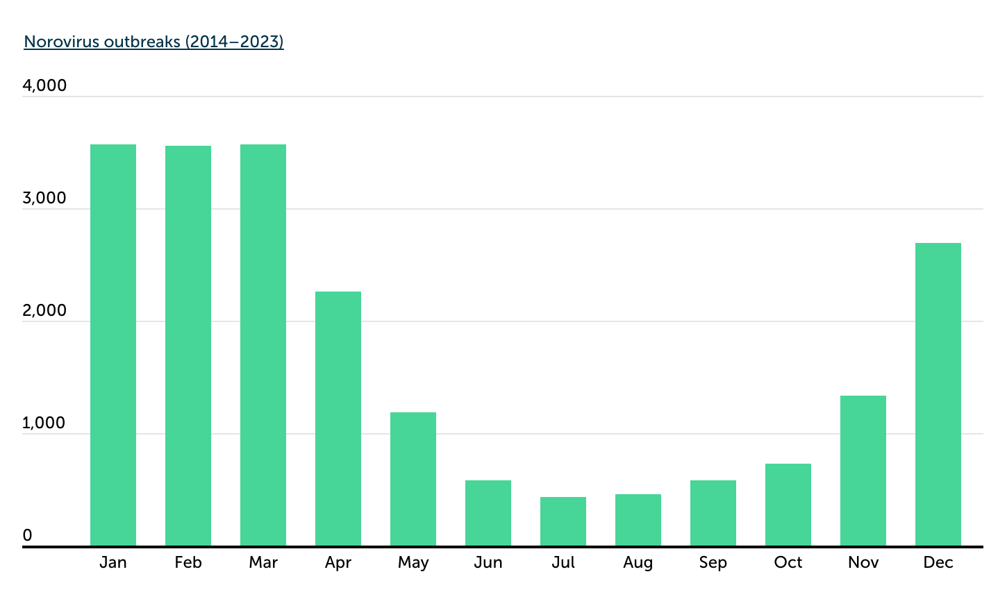 Norovirus activity consistently begins to rise during the winter months and remains elevated into early spring. From 2014 through 2023, the highest number of outbreaks occurred in January, February, and March, with each month recording more than 3,500 outbreaks nationwide. These three months alone accounted for more than half of all reported norovirus outbreaks during the 10-year period.