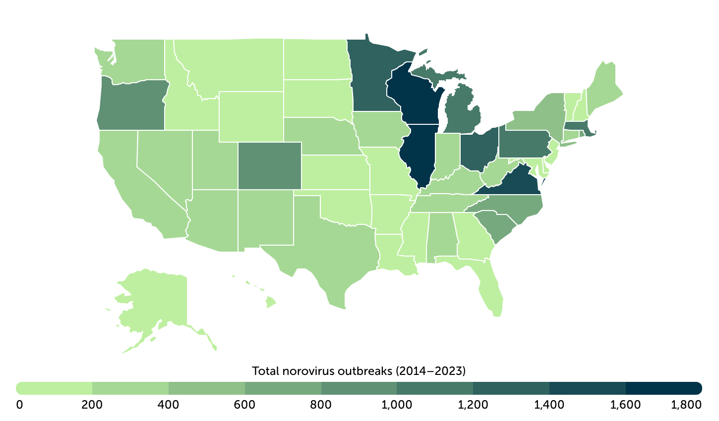 Across the United States, norovirus outbreaks are not evenly distributed. States in the Midwest accounted for a disproportionate share of reported outbreaks over the past decade. Wisconsin, Illinois, Minnesota, Ohio, and Michigan all ranked within the top 10 states for total outbreaks. Wisconsin alone reported 1,739 outbreaks—representing 8.3% of the national total—the highest total in the country.
