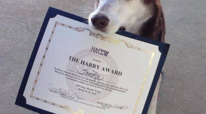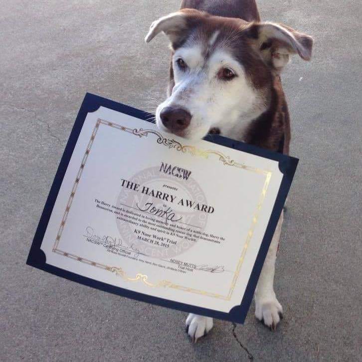 Shannon Thier (North Carolina) Nose work! K9 Nose Work brought new life and a purpose into my senior dog, Tonka. It literally breathed new confidence into her. We were beginners and earned our NW1 title, Pronounced in all four elements—interior, exterior, vehicles, and containers—in our first trial, and she won the Harry Award (an award given to one rescue dog who showed the most spirit for the sport of nose work) when she was 14 years old. ‘Pronounced’ means, according to the sport’s co-founder, Ron Gaunt, that mutual performance between dog and handler team “stirred the judges’ giblets.” That’s verbatim.